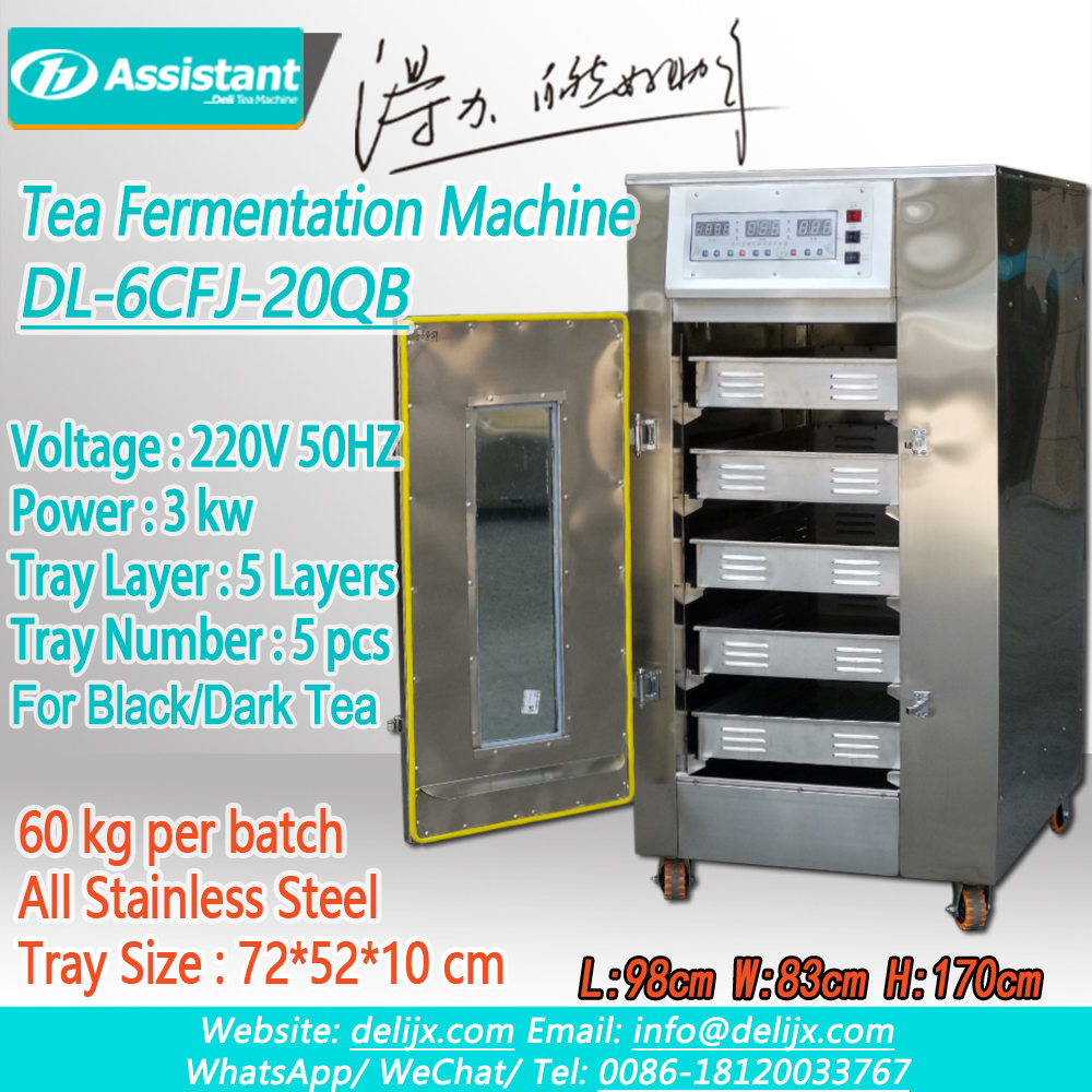 Siyah çay ve koyu çay işleme için kullanılan DL-6CFJ-20, akıllı sıcaklık ve nem kontrolü sayesinde çay oksidasyon fermantasyonunun en iyi kaliteye ulaşmasını sağlar, makine 5 adet paslanmaz çelik tepsiye sahiptir, parti başına 60 kg kapasiteye sahiptir.